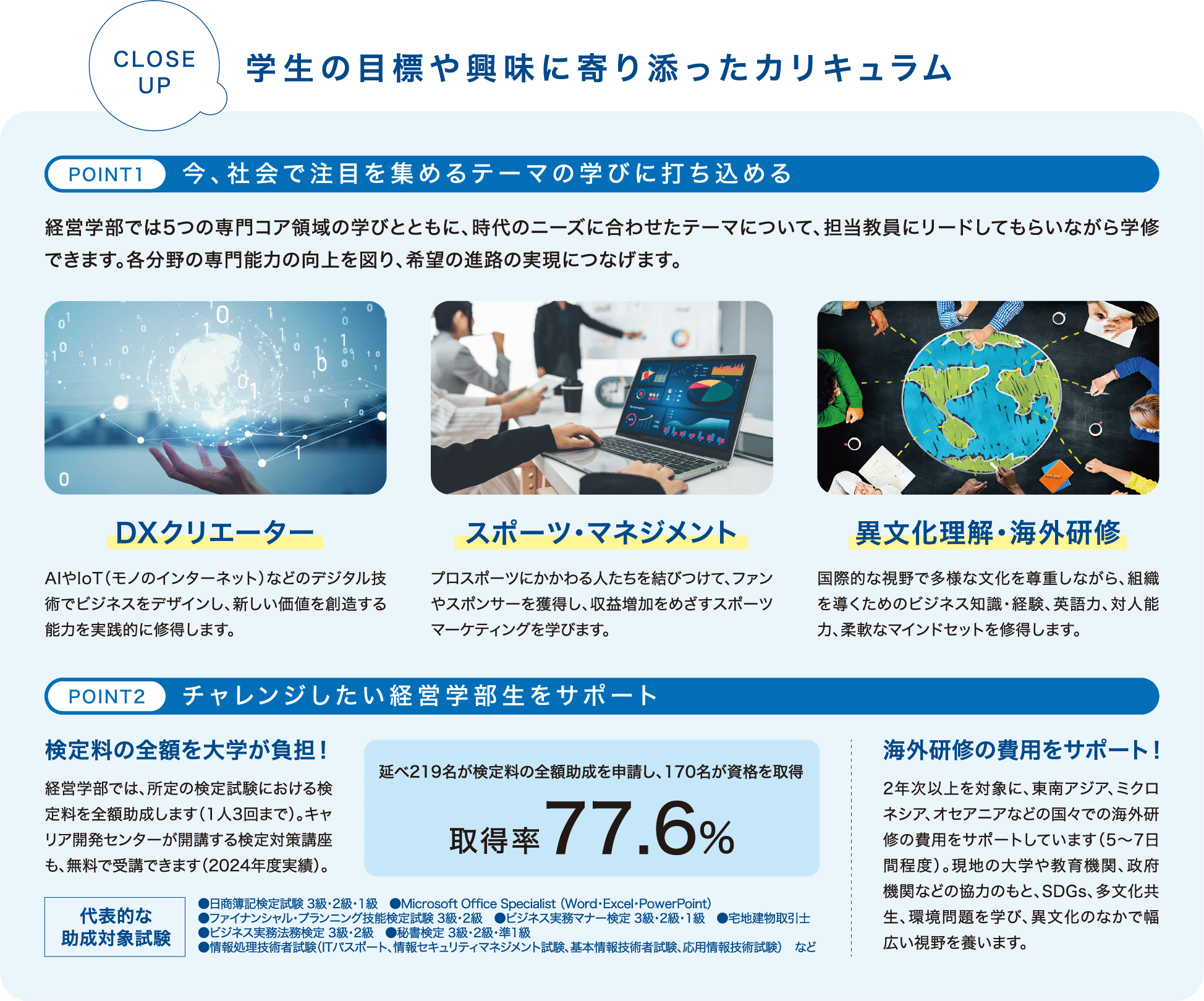 経営学部では、人間生活と社会に貢献する企業・組織経営に関する確かな知識・技能とともに、高邁な人格と高いコミュニケーション能力を身に付けた人材の養成を目的としている。この目的を達成するために、カリキュラムを「専門科目群」「演習科目群」及び「免許・資格関連科目群」に分け、さらに「専門科目群」を「基礎科目」「基幹科目」「展開科目」「応用科目」及び「教職教科専門科目」に区分している。「基礎科目」は、経営、商学、会計、経済の各分野の基礎的な知識を身に付ける科目を開講している。「基幹科目」および「展開科目」は、経営、流通・マーケティング、会計、経済・金融、法律(社会制度)に関する科目を配置し、さらに、「応用科目」では、情報、グローバルコミュニケーション、スポーツの分野も加えて、基礎知識から実践で必要な知識まで、発展的に身に付けることが出来る。「演習科目」は、1年次では、専門的職業人として必要な幅広い教養、および、チームワーク・共生の精神を身に付け、2年次では、コミュニケーション・スキルや論理的思考力、3年次では、課題発見力およびその解題に対する論理構築力を身に付ける。そして、4年次では、専門を極め、コミュニケーションやプレゼンテーションの能力及びリーダーシップを発揮する能力を身に付ける。さらに、統合的な学習経験から創造的思考力を身に付け、主体的に研究に取組む態度を養い、卒業研究の取組みを通じて学生同士が互いに支え合い、共に研究を進めることのできるチームワーク力を養う。さらに、学修サポートとして「特別プログラム」を実施している。これは担当教員の専門性および指導に対する特殊的熟練を基に構成され、特定のキャリアプランに向けた専門的な学びの場を提供して、実践的なスキルの体得だけでなく、社会で役立つ人間力も養っていく。