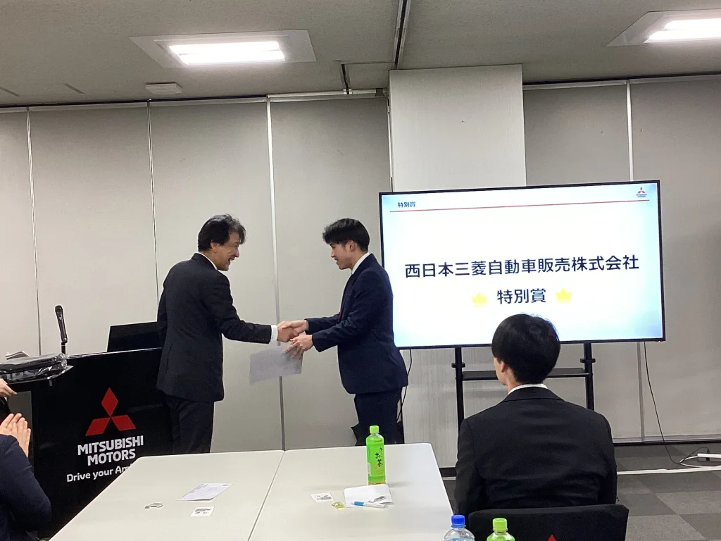 審査の結果、Cグループ(川北君・久保君・小笹君・高見沢君)が「三菱自動車工業株式会社特別賞」を、Dグループ(今村君・香川君・笹崎君)が「西日本三菱自動車販売株式会社特別賞」をそれぞれ受賞しました。