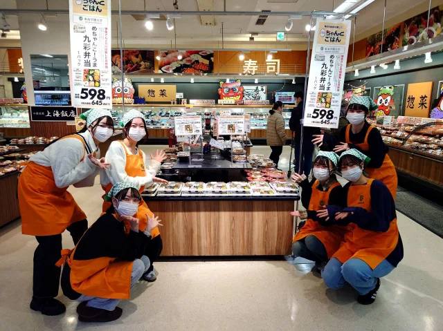 この弁当は、3年生の地域保健活動演習の履修生が4チームに分かれてレシピ開発に取り組み、各チームの良いところを合体した「めちゃんこ!うま九彩弁当」が販売に至ったものです。