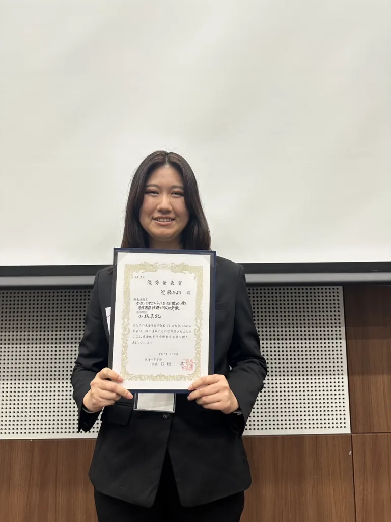 スポーツ健康科学部スポーツ健康科学科卒業生の近藤ひよりさん(2023年度卒業、現在日本福祉大学大学院スポーツ科学研究科に在籍)が、11月8日に開催された東海体育学会第72回大会において、優秀発表賞を受賞しました。