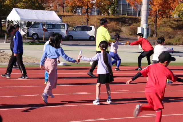 今回の教室では、走り方の他にリレーのバトンパスをみんなで練習しました。最後には小学生と大学生がチームを作り、400mリレーに挑戦!!全チームがバトンを落とすことなくゴールすることができました。