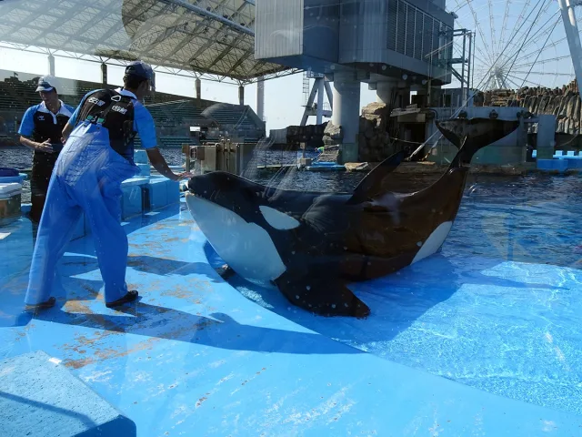 …見学会の数日後、2頭のシャチのうちの1頭でオスのアースが急逝したことが報道されました。16歳という若さでした。鴨川から名古屋にやってきて10年、迫力ある巨躯と愛嬌のある優しい顔で、いつも正面水槽でお出迎えしてくれたアース。謹んで哀悼の意を表します。(画像はメスのリン・12歳)