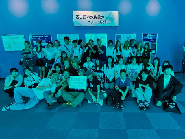 試験週間が明けた暑い夏の日の午後、心理学部恒例の学外見学会が開催されました。本年度の会場は名古屋港水族館。初めての定期試験を終えたばかりの1年生を中心に、総勢48名が参加して水辺の生き物とのふれあいを楽しみました。