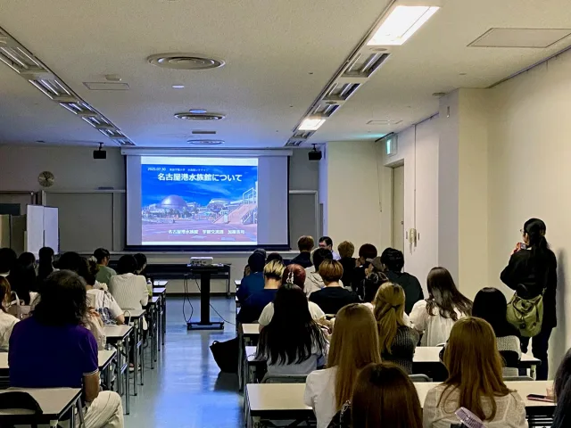 学外見学会は、さまざまな施設や展示を“心理学的な視点”で見学する体験型学習として、毎年春学期の終わりに行われています。今回は、水棲生物の観察を通じて心理学への興味と理解を深めるのがミッション。まずは名古屋港水族館学芸員の加藤浩司先生から、ミニ講義を受けました。名古屋港水族館の特徴や展示テーマの解説に始まり、シャチを被験体にした心的回転(メンタルローテーション)実験、色を弁別刺激として用いたイシダイの条件づけ、脳を持たない棘皮動物であるヒトデの学習様行動といった、たいへん興味深いお話をうかがうことができました。