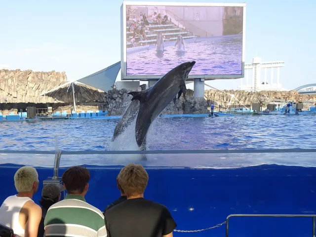 ミニ講義のあとは、館内を自由散策。ひとつの展示水槽を集中して観察するもよし、すべての水槽の生き物を網羅的に制覇するもよし、各自が思いおもいに見学を楽しみました。2時間ほどの自由散策の後、見学会のクライマックス・プログラムはイルカたちのパフォーマンスです。世界最大級のイルカプールで繰り広げられる圧巻のショータイムを、全員でスタジアムから観覧。砂かぶり(水かぶり?)席に陣取った学生たちは時おり頭から水しぶきを浴びていましたが、暑い日差しとともに夏の日の良い思い出になったのではないかと思います。