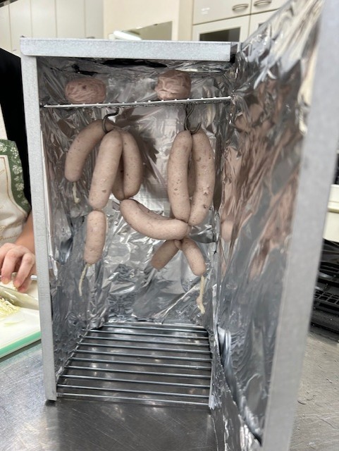 仁科先生 (本学健康栄養学部 教授) の指導の下、学生ボランティア7名と協力しながら、最初に豚ロース肉の角切りをミートチョッパーでひき肉にして、調味料や塩漬剤を加えてソーセージのたねを作りました。続いて、スタッファー (たねを羊腸に充填するための道具) を使って、羊腸にたねを詰めて形を整えた後、加熱・冷却・燻製の工程を順に行ってソーセージが完成しました。出来上がったソーセージは、炒めたキャベツと一緒にパンに挟んでホットドッグにして、みんなで試食しました。「ソーセージがこのようにして作られていることを理解できた」「とっても美味しい」といった意見をたくさんいただき、あっという間に完食されていました。
