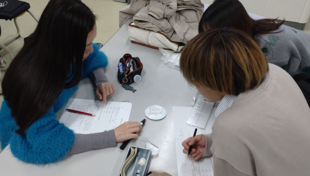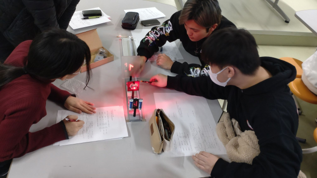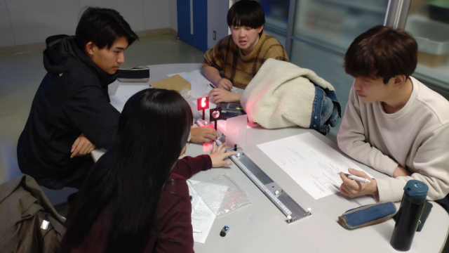 この日は、中学校理科・高等学校物理でも取り上げられる、光の反射・屈折と、凸レンズの性質についての実験でした。凸レンズの性質を調べる際には光学台と呼ばれる実験器具を用いて、物体から凸レンズまでの距離と、凸レンズから像までの距離を測定し、その規則性を探りました。距離を適切に調節すると、スクリーンにきれいな実像が映りますが、元の物体とは上下左右が逆になります。受講学生の皆さんは、教科書を通して学んだ内容が実際に目の前に現れるさまに興味津々で、様々な大きさの実像が映らないかと、条件を変えて試している様子でした。