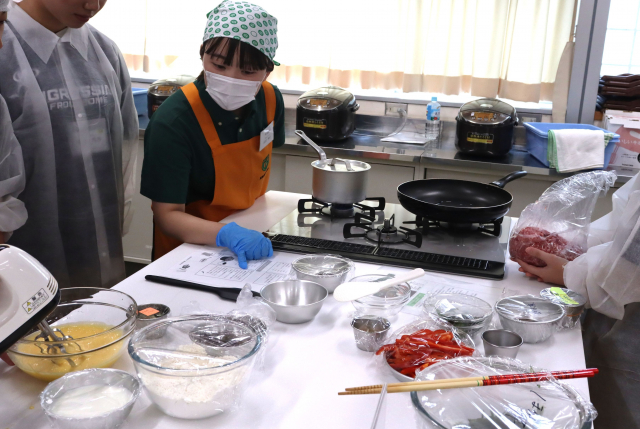 次に学生活動発表として、学生サポーターよりNEXCO中日本との商品開発とあいち伝統野菜の普及活動の紹介をしていただきました。続いて、新宮先生より模擬授業(講義)「身近な病気から学ぶ栄養のヒント~医師から貧血撃退のヒントを学ぼう!!~」を行っていただきました。その後、調理実習室へ移動して馬場先生から「あっと驚く鉄分豊富メニューを作ろう」の調理実習が行われました。高校生の皆さんが作った料理を囲んで、授業内容の話や作った料理の感想などで和気あいあいと交流していました。