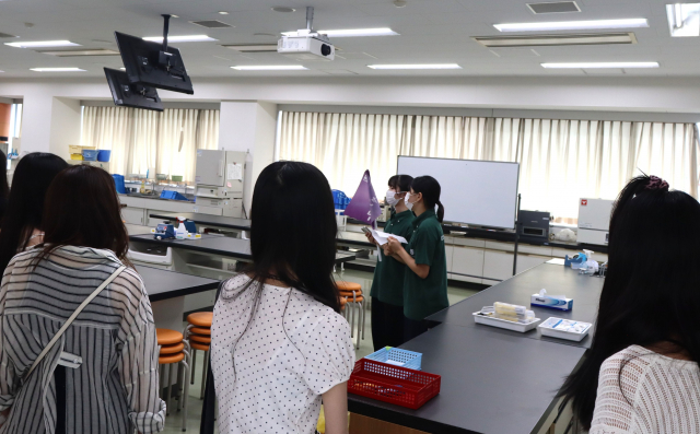 9月7日(日)、高校生45人とその保護者28人をお迎えして、今年第2回目の学びの体験講座を実施しました。最初に学部長の兼平先生より全体説明をしていただきました。続いて徳永先生より管理栄養士専攻の紹介をしていただき、西田先生より食品開発専攻の紹介をしていただきました。