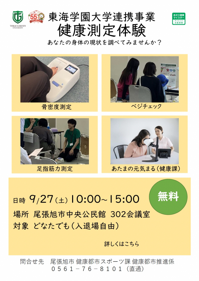 9月27日 (土)、尾張旭市と東海学園大学との連携事業である「健康測定体験会」に参加し、学生たちは骨密度測定、ベジチェック、足指筋力測定を担当しました。高齢の方が多く来場されたため、聞き取りやすい声で説明したり、待ち時間に安心できるように声をかけたりと、工夫をしながら取り組んでいました。参加者からは、「笑顔で対応されている姿に感心しました」「測定後のアドバイスが分かりやすく、今後の参考になりました」などの感想をいただきました。学生にとっても、普段の授業では体験できないコミュニケーション力の大切さを実感する貴重な学びの機会となりました。