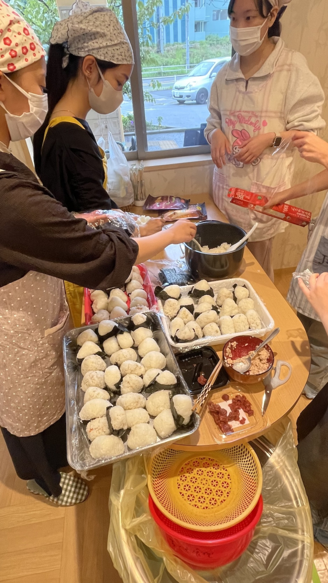 今月の子ども食堂のテーマは、「運動会」でした。学生達は、昼食のお弁当作りと運動会の看板づくりの活動を行いました。子ども達は、元気いっぱいに玉入れやボール作りに歓声を上げながら楽しんでいました。たくさんのおにぎりを準備しましたが子ども達が何回もお代わりに来てくれてあっという間に完食でした。昼食のお弁当メニューは、おにぎり(梅、鮭、ツナマヨ)、卵焼き、たこさんウィンナー、ゴーヤチャンプ、たまねぎとピーマンのマリネ、揚げポテトでした。