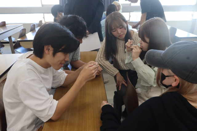 学内の10か所を回りながら、グループごとに出される謎を解いていきました。問題の難しさはさまざまで、仲間と相談しながら頭をひねったり、「知恵の輪」をみんなで力を合わせて解いたりと大盛り上がりしました。