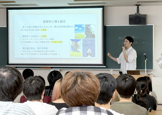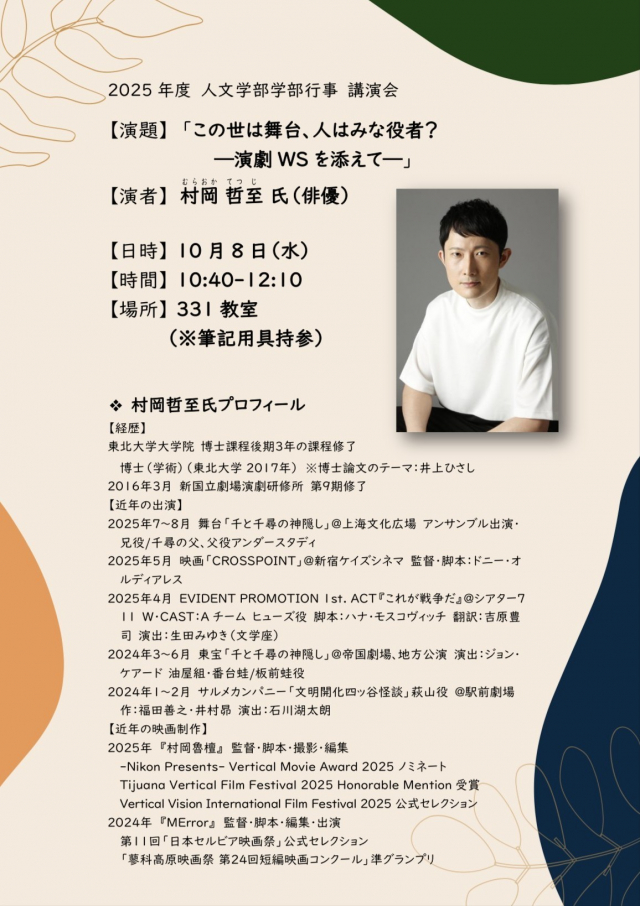 10月8日、人文学部の学部行事として、俳優・村岡哲至さんによる講演+ワークショップ「この世は舞台、人はみな役者?」を行いました。