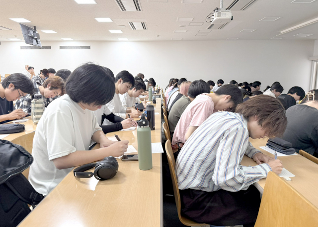 また簡単な演技体験として、「手紙ワークショップ」を体験しました。学生たちはまず「感謝の手紙」を書き、ペアを組んだ相手と手紙を交換して相手の手紙を読み上げ、さらにその「もともとは自分が書いたものでない手紙」を、今度は別の相手に「自分の手紙として」読み上げる、ということを行いました。