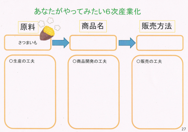 6次産業化の実例の話の内容などに関して、受講生は熱心に聴講していました。また、あなたがやってみたい6次産業化のワークシートで各学生が考えた案の発表が活発に行われました。
