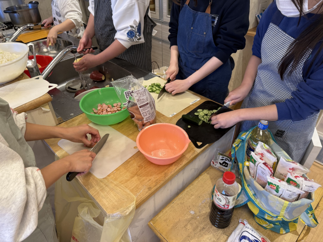 今月の子ども食堂のテーマは、「クリスマスを楽しもう」で学生達は、子ども達が楽しみにしている昼食作りの活動を行いました。昼食のメニューは、ケチャップライス、青菜のツナ和え、さつまいものサラダライム添え、さつまいもきんとん、柿、みかんなど旬の食材をふんだんに使用したメニューでした。