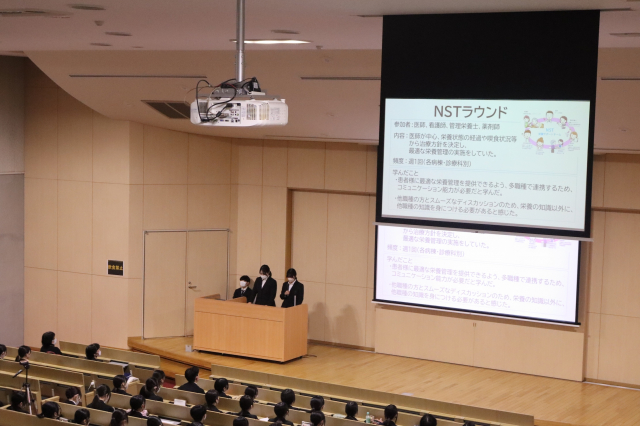 12月15(月)、令和7年度臨地実習全体報告会を行いました。臨地実習全体報告会とは、臨地実習で得た学びを学部全体で共有し、管理栄養士としての視点を深めるための振り返りの場です。
