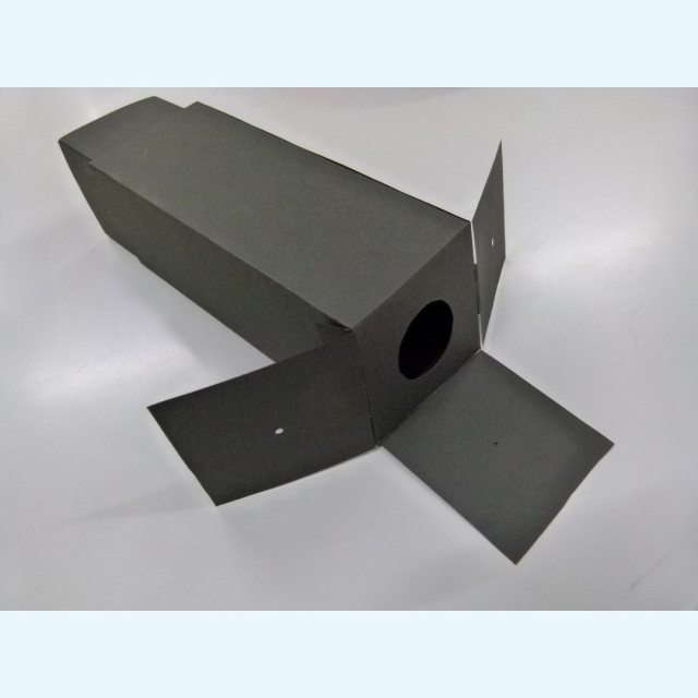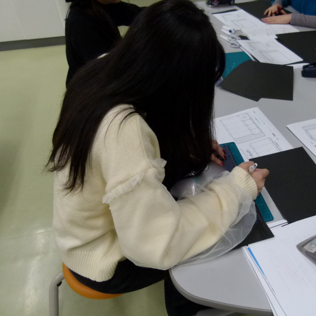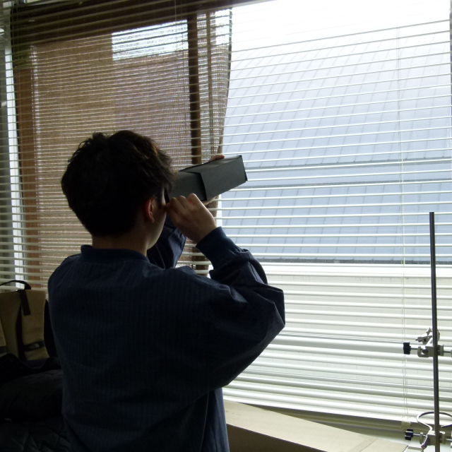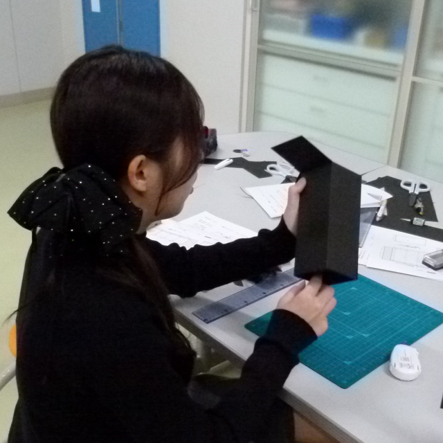この日は、光の諸性質への理解を深めるものづくりとして、ピンホールカメラの作成に挑戦しました。黒画用紙を用いて箱状の物体を作り、箱に小さな穴を開けて、適切に調節すると、スクリーンに見立てたトレーシングペーパーに外の景色が映ります。針穴の代わりに凸レンズを用いると、明るい倒立実像を観察することも可能です。受講学生の皆さんは熱心に取り組み、外の景色が映った瞬間に歓声をあげていました。