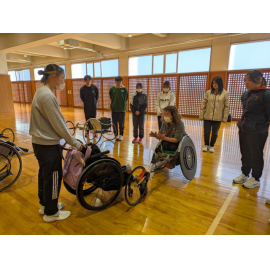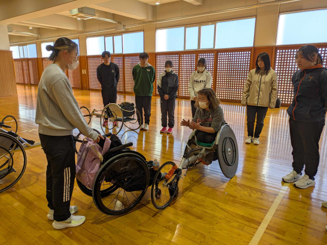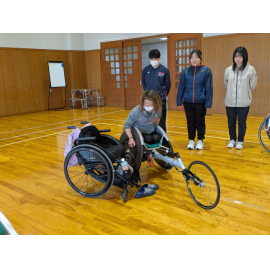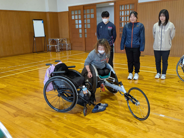 ボランティアとしてイベントに参加する学生は、事前研修を受け、当日の活動内容や車椅子の使い方等について学習してから本番に臨みます。今回は事前研修会の講師に、田中照代選手(オフィスTI-R)をお招きしました。田中選手はこれまでパラリンピック4大会に出場し、陸上競技で5個のメダルを獲得しています。現在も現役選手として活動しており、名古屋ウイメンズホイールチェアマラソンにも毎年出場しています。