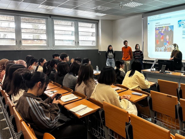 ミラノでは、ミラノ大学(Università degli Studi di Milano)の食品・環境・栄養科学部(Department of Food, Environmental and Nutritional Sciences)を訪問しました。講義では、イタリアにおける栄養学研究や教育の取り組みについて説明を受けるとともに、「One Health(ワンヘルス)」という概念について学びました。One Healthとは、人の健康だけでなく、動物や環境の健康を一体として捉える考え方であり、持続可能な社会の実現に向けて国際的に注目されています。講義では、栄養学が食環境や食品生産などと密接に関わりながら、人と環境の健康を支える重要な分野であることが紹介され、健康をより広い視点から考える必要性について理解を深めることができました。