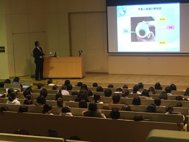 12月10日(月)に、「若い世代からの口腔ケアのすすめ」と題して、愛知県歯科医師会地域保健部の吉岡弘二先生にご講演をいただきました。講演では、2018年6月に健康栄養学部1.2年生を対象に実施された健診結果をふまえ、口腔状態と全身の健康との関係や、定期的な歯科健診の重要性についてのお話がありました。1時間半の講演でしたが、実に内容が深く、出席した学生たちにとって、口腔ケアの大切さを学ぶ貴重な機会となりました。