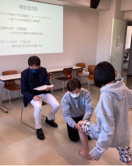 通常のインソールとは異なり、人の動作分析を行って処方するということにとても驚きました。動作分析の練習を重ねていく中で、人それぞれの特徴を捉えて正確な位置にパッドを貼ることで良いインソールを処方することが出来ると感じました。今回学んだことを活かして卒論や将来に役立てていきたいと思います。
