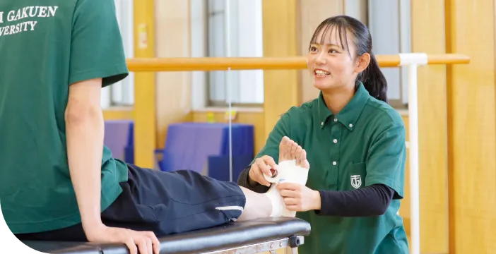 「健康運動実践指導者」の資格取得をめざし、少人数制指導によるきめ細かなサポート体制を整えています。2・3年次に、週1回の講座や本番前の実技試験対策を実施。2025年度は、スポーツ健康科学部の受験者全員が合格しました。「健康運動指導士」資格試験には、全国初となる学部3年生での合格を果たしました。1年次より体系的に学び、2・3年次に現場力を養成する段階的カリキュラム設計と、少人数制による実践的指導体制が、早期での高難度資格取得につながりました。