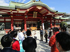 まずは「十日えびす」で有名な西宮神社に到着しました。こちらは全国のえびす宮の総本社です。参拝を済ませた後、宮司さんより、神社の成り立ちや室町時代から残る練塀(ねりべい)のお話、阪神淡路大震災時には建物の倒壊などの被害を受けたがその後いろいろな支えを経て復興を遂げたお話などを詳しくご説明いただきました。