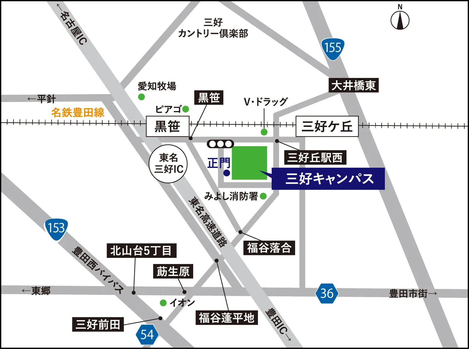 - 名鉄豊田線(地下鉄鶴舞線直結)「三好ケ丘」駅下車、徒歩約10分。