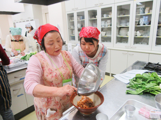 講義が終わると調理実習です。今回調理するのは“田作り、りんごきんとん、紅白かまぼこ、伊達巻き、松風焼き、菊花かぶの甘酢漬、お雑煮”です。「きんとん」を栗ではなく、りんごで作ったり、伊達巻の砂糖の量を減らすことにより摂取エネルギー量を減らしました。紅白かまぼこの飾り切りのデモンストレーションでは、先生の巧みな技に驚きの声があがっていました。今回は品数が多く、調理が大変でしたが班で協力して次々と完成させていました。今回得た知識と技術で、来年のお正月には皆さんも是非“ダイエットおせち”に挑戦してみてください。お疲れ様でした。