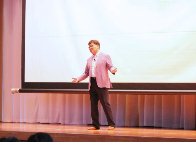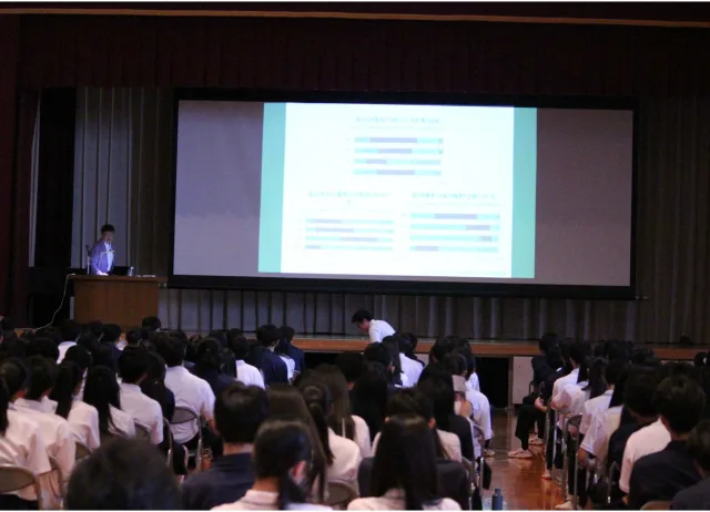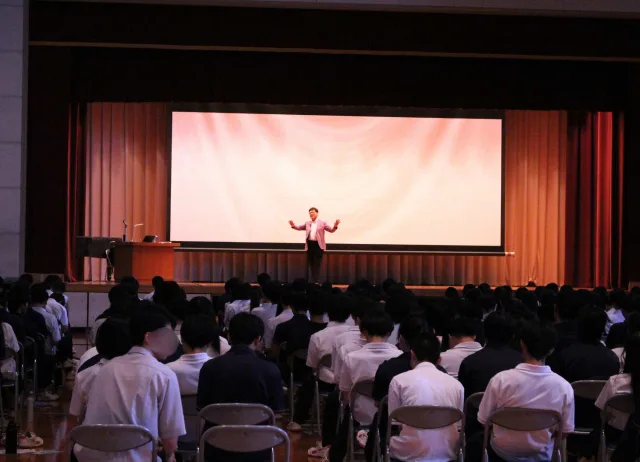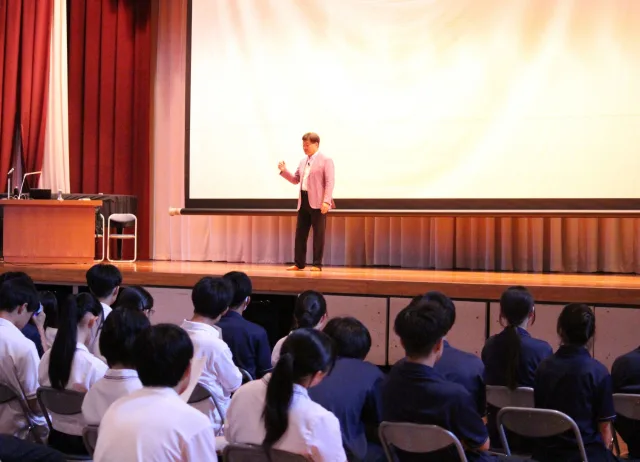 「自分の輝きを見つけよう」をテーマに、講演では、国際比較の調査結果から「日本の若者は、他国の若者に比べて“自分を優れた存在だと感じていない”割合が高い」と指摘。そのうえで、「誰一人として価値のない人はいない。一人ひとりがかけがえのない“輝き”を持った存在である」と語りました。成績や偏差値といった限定的な指標にとらわれることなく、「人に優しい」「誰かを笑顔にすることが得意」「気遣いができる」など、多様な価値観の中で自分の魅力を再発見してほしいというメッセージが伝えられました。
