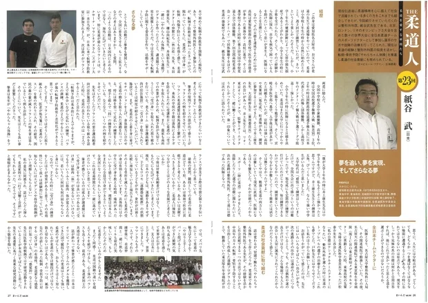「THE柔道人ー柔道を愛する仲間たちー」のコーナーで、紙谷教授の経歴から、現在柔道を生かした社会貢献として取り組まれている「やわらちゃん体操」、また今後の夢まで2ページにわたって紹介されています。