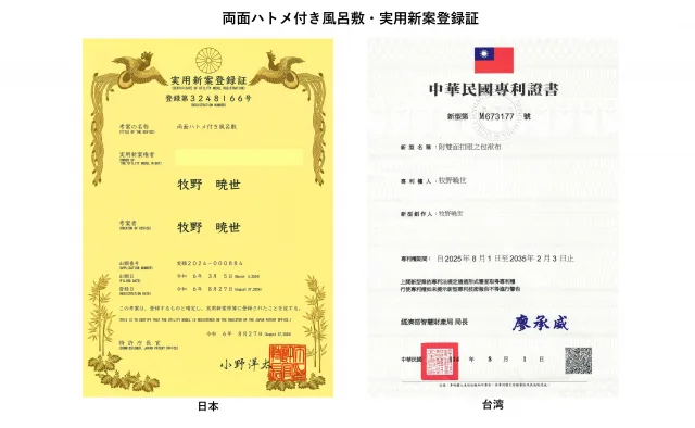 実用新案登録とは、物品の形状や構造についての考案を保護するもので、登録されることでその考案を独占的に実施する権利が得られるものです。今回、日本での登録に加えて、台湾においても実用新案登録がされ、W取得となりました。