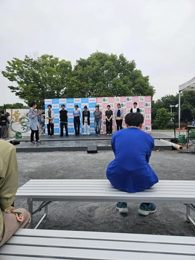 横断幕はタームごとに出展会場に設置されるもので、「地球を愛する学園祭」と書かれた白布に、タームごとに決定されたスローガンやイラスト等が描かれました。その後、各出展大学がステージに出演し、それぞれの出展計画について公開プレゼンテーションを行いました。