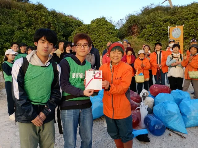 今年度は、BSCウォータースポーツセンター主催の社会貢献プロジェクト「ミライキフ」の支援対象として本活動が選出されました。同センターが実施する「びわ湖自然体験学習」参加者の投票により決定した53,270円の寄付金を受け、本学はその全額を海謝美へ贈呈いたしました。贈呈式は2月13日、与論島の海岸にて行われました。寄付金は、海洋ごみ清掃活動のPR動画制作費として活用される予定です。