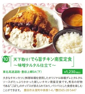 このたび、健康栄養学部徳永ゼミの産学連携活動として、東名高速道路豊田上郷サービスエリア(下り)フードコートにおいて学生と三岐鉄道株式会社様の共同作成した料理『天下取り!でら旨チキン南蛮定食』が販売されております。