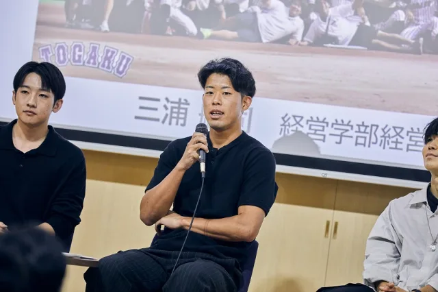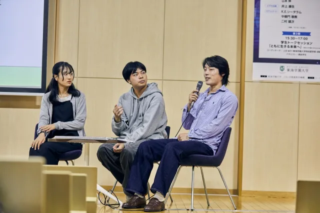 第2部では、上田特命副学長による「ともに生きる未来へ」をテーマに在学生によるトークセッションが行われました。
