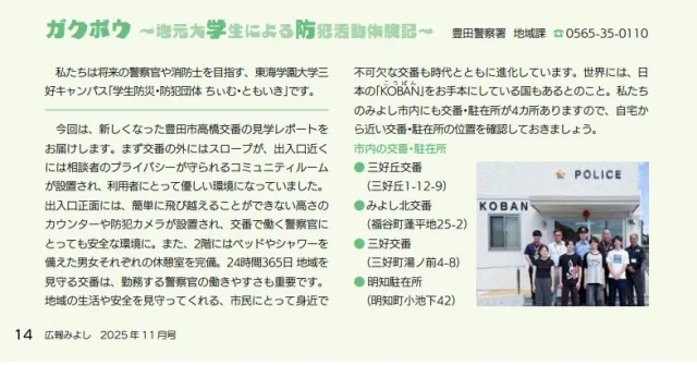 三好キャンパスで警察官・消防士を目指す学生サークル「学生防災・防犯団体 ちぃむ・ともいき」と豊田警察署がコラボレーションし、「広報みよし」で連載企画を行っています。防犯活動体験記「ガクボウ」のコーナーで、防犯など警察が担う取組みを学生目線で伝えています。