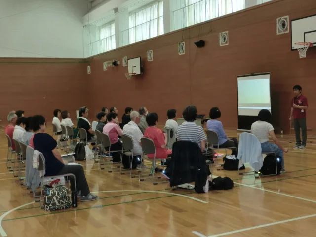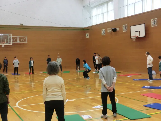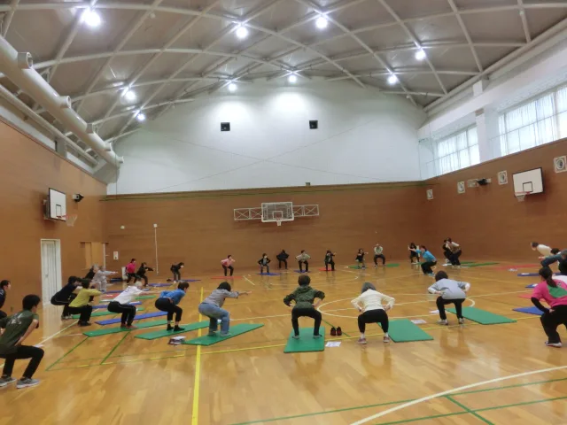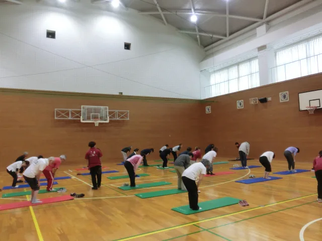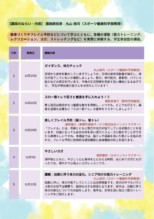 本講座は中高年の方々を対象に、健康づくりやフレイル予防などについて学びながら、実際に筋力トレーニング、レクリエーション、ヨガ、ストレッチングなど多彩な運動を体験していただく内容となっています。