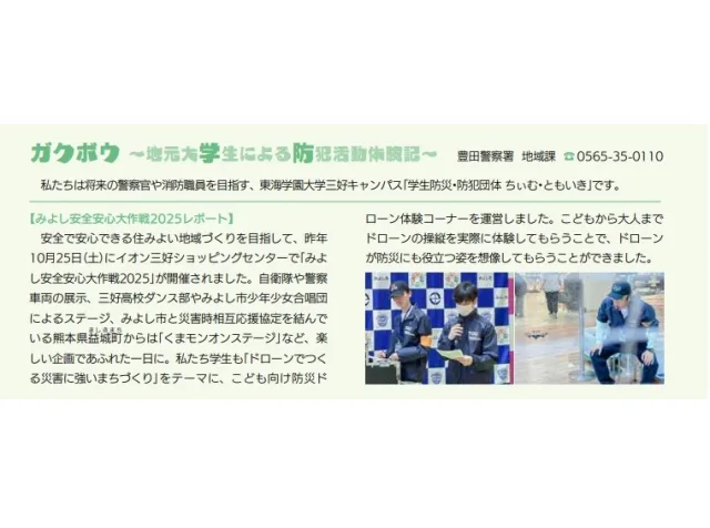 三好キャンパスで警察官・消防士を目指す学生サークル「学生防災・防犯団体 ちぃむ・ともいき」と豊田警察署がコラボレーションし、「広報みよし」で連載企画を行っています。防犯活動体験記「ガクボウ」のコーナーで、防犯など警察が担う取組みを学生目線で伝えています。
