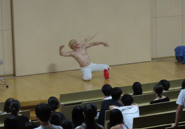 当日は、限られたステージ空間にもかかわらず、いくつかのダンスを披露してくださり、その豊かな表現力と存在感に心を打たれました。トークでは「理想は叶わなくても、自分らしい表現を探し続けることが大切」と語られ、学生たちは「障害」ではなく「ありのままの自分」を大切にする生き方に強く心を動かされました。今回の催しは、学生にとって生き方や価値観を見つめ直す貴重な機会となりました。