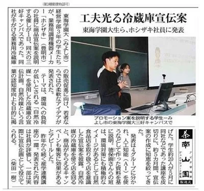10/2(木)中日新聞に、本学経営学部成田ゼミとホシザキ(株)との産学連携企画として、学生が業務用冷蔵庫の販売促進案を発表した記事が掲載されました。
