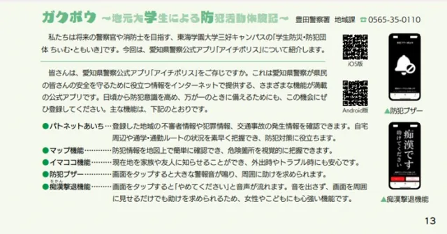 三好キャンパスで警察官・消防士を目指す学生サークル「学生防災・防犯団体 ちぃむ・ともいき」と豊田警察署がコラボレーションし、「広報みよし」で連載企画を行っています。防犯活動体験記「ガクボウ」のコーナーで、防犯など警察が担う取組みを学生目線で伝えています。