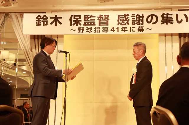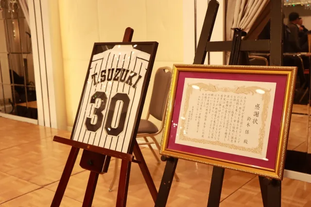 その後は、硬式野球部OB会長の感謝の言葉、教え子の田島さん(現 中日ドラゴンズ2軍ピッチングコーチ)からの感謝状並びに記念品の授与、元硬式野球部マネージャーからの花束贈呈、そして最後は鈴木前監督からの感謝の言葉で締めくくられました。