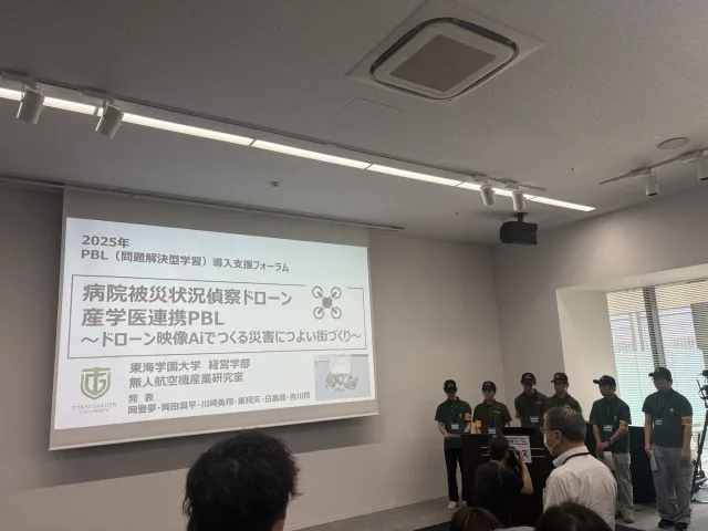 米本ゼミは「病院被災情報偵察ドローン・産学医連携PBL ~ドローン映像AIでつくる災害に強いまちづくり~」をテーマに、企業担当者や大学関係者を前に計2回のプレゼンテーションを実施。準備段階から実践に至るまでのプロセスを学生自らの体験を交えて発表し、専門家からの講評もいただきました。