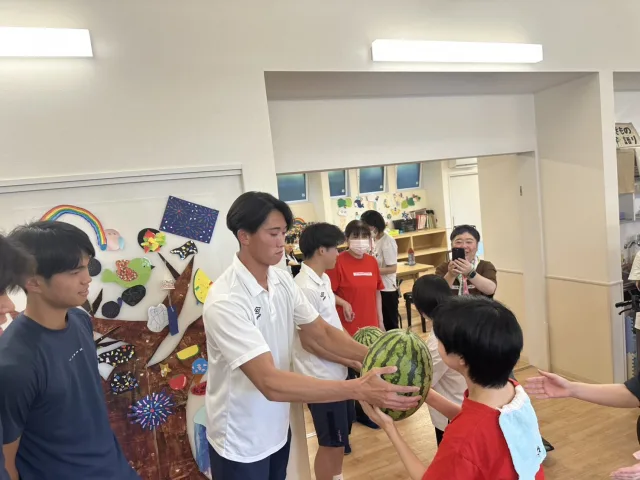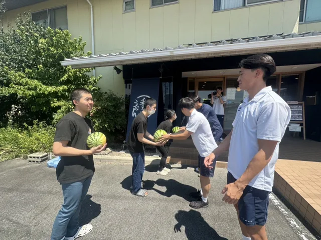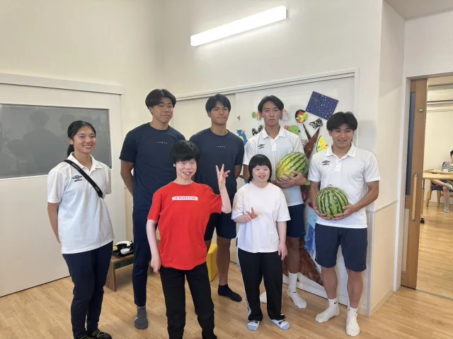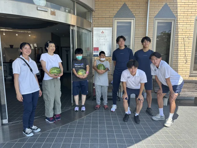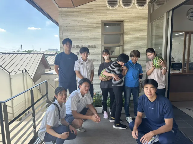 2025年7月29日(火)、本学男子サッカー部員5名が久野元みよし市長と共に、みよし市内の4つの施設(特定非営利活動法人 いきもの語り様、社会福祉法人 昭徳会 泰山寮様、社会福祉法人 あゆみの会様、社会福祉法人 あさみどりの風〈うどん和來〉様)を訪問し、畑で育てたスイカを贈呈しました。