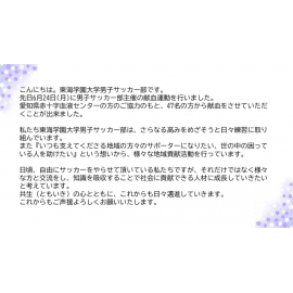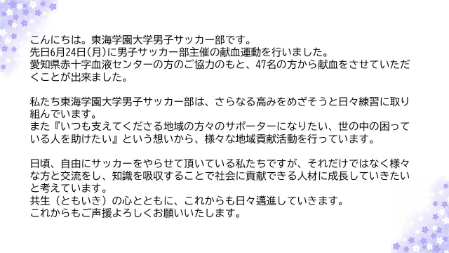 前回に引き続き、愛知県赤十字血液センターの皆様にご協力いただき、サッカー部員および当日参加した学生などをあわせて47名が献血を行いました。初めて献血をした学生も多く、最初は不安そうにしている者もいましたが、すべて終了した後は社会貢献ができた充実感からか、とても爽やかな表情をしている姿が印象的でした。