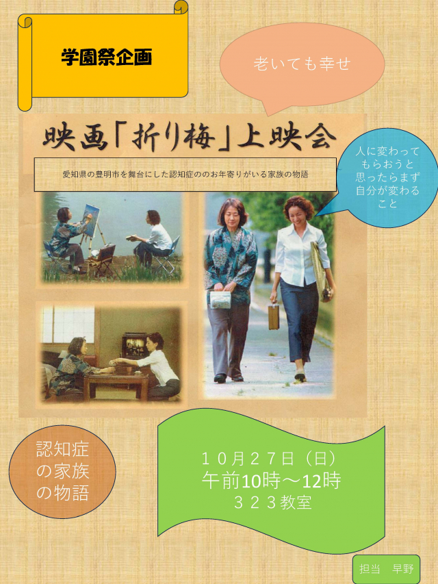 10月27日(日)10:00~12:00 本学三好キャンパス にて、映画「折り梅」の上映会を開催します。