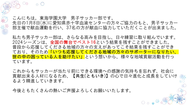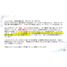 男子サッカー部は本企画以外にも様々な社会貢献活動を行っています。普段の練習への取り組みに限らず、各活動も全力で行っていますので、引き続き温かいご声援のほどよろしくお願いいたします。