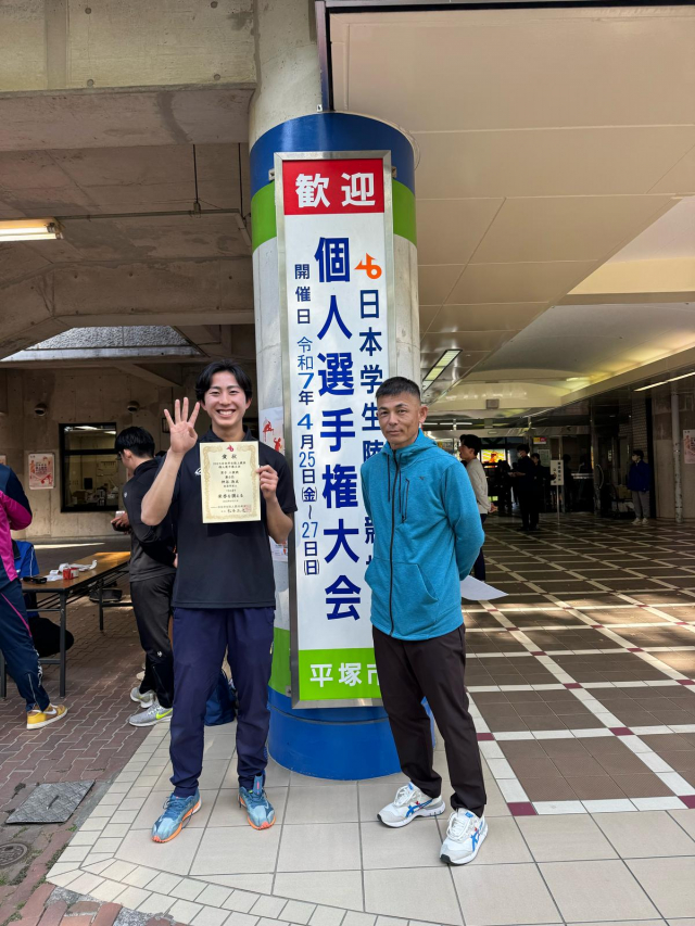 また、4年生の神谷海成も日本学生陸上競技個人選手権の男子三段跳で4位入賞し、全国規模の大会で初の入賞を果たしました。日本インカレの決勝進出はなりませんでしたが、西日本インカレでは5位入賞を果たしました。